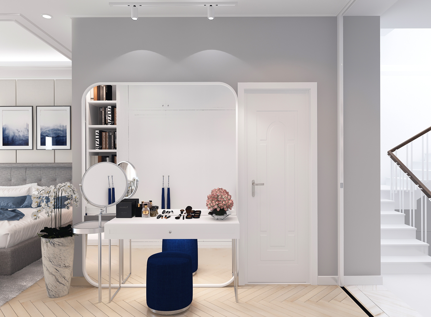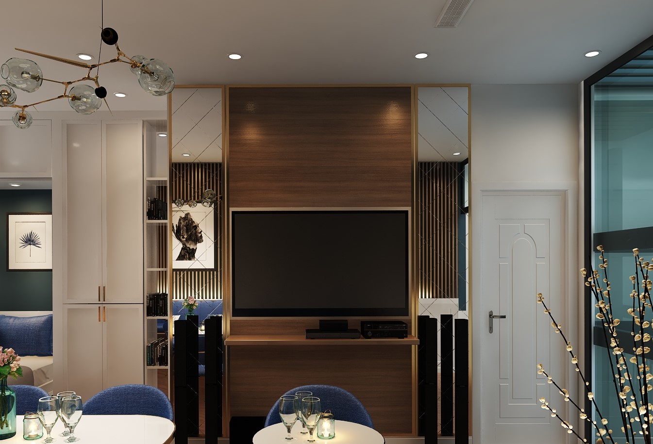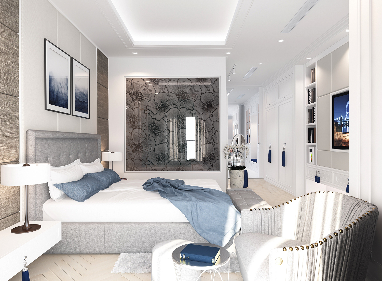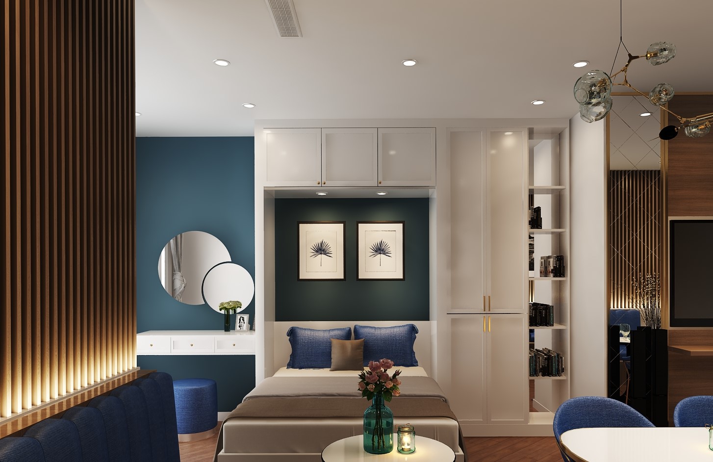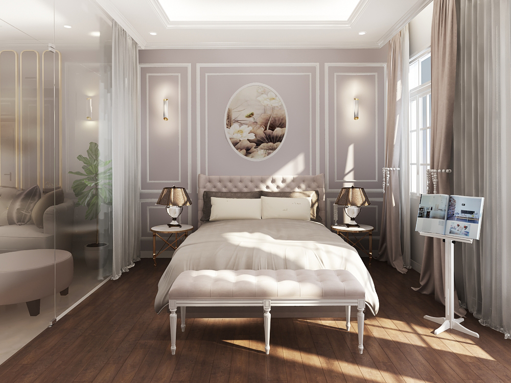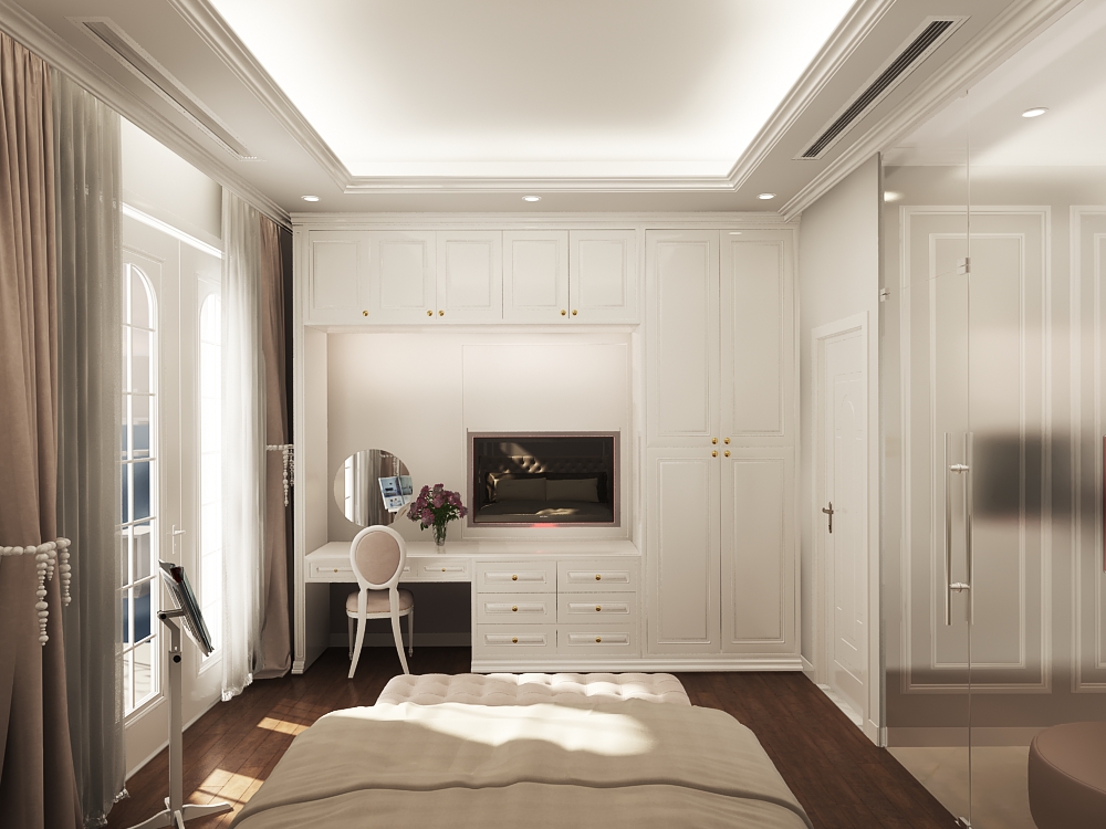 Các đường phào chỉ, vòm cong và chi tiết bo mềm được xử lý vừa đủ, không cầu kỳ nhưng vẫn gợi nhắc tinh thần cổ điển đặc trưng. Vật liệu vải nỉ, nhung và đá vân tự nhiên mang lại chiều sâu thẩm mỹ, trong khi điểm nhấn xanh lam – xanh navy được đưa vào khéo léo giúp không gian thêm phần trẻ trung, hiện đại.
