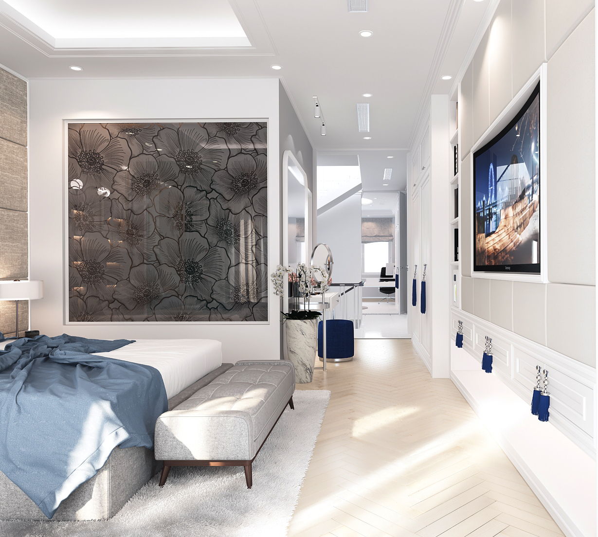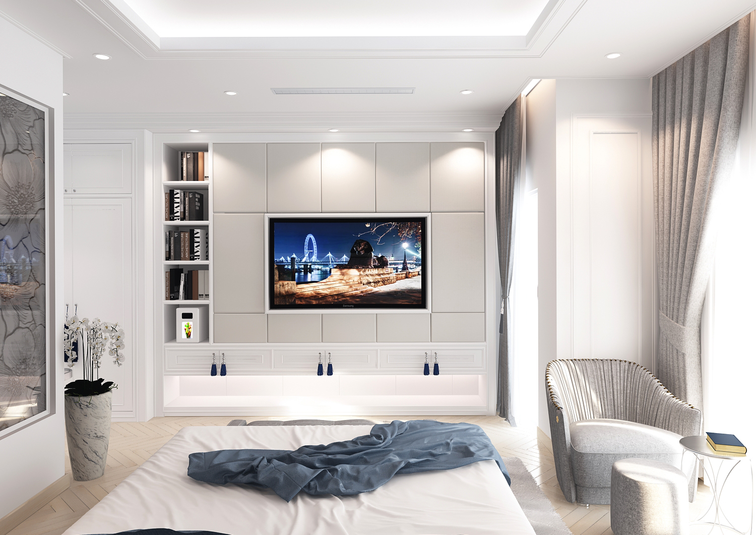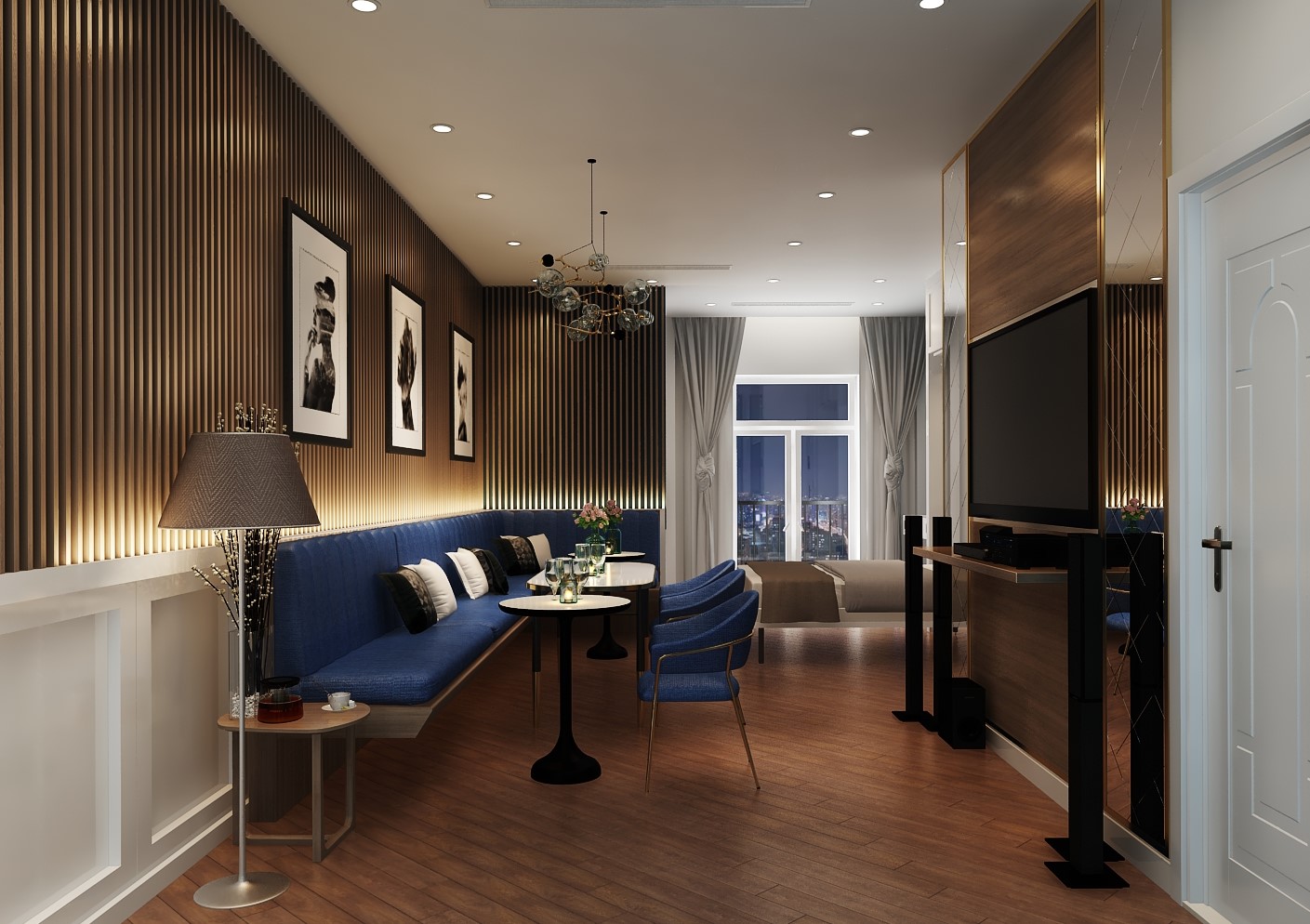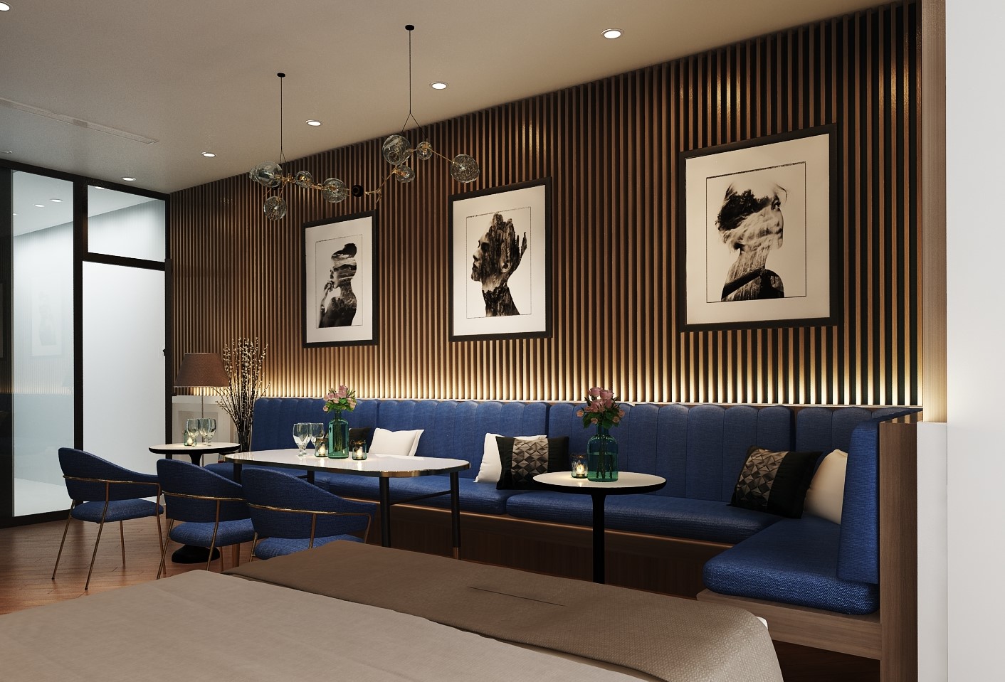 Các đường phào chỉ, vòm cong và chi tiết bo mềm được xử lý vừa đủ, không cầu kỳ nhưng vẫn gợi nhắc tinh thần cổ điển đặc trưng. Vật liệu vải nỉ, nhung và đá vân tự nhiên mang lại chiều sâu thẩm mỹ, trong khi điểm nhấn xanh lam – xanh navy được đưa vào khéo léo giúp không gian thêm phần trẻ trung, hiện đại.