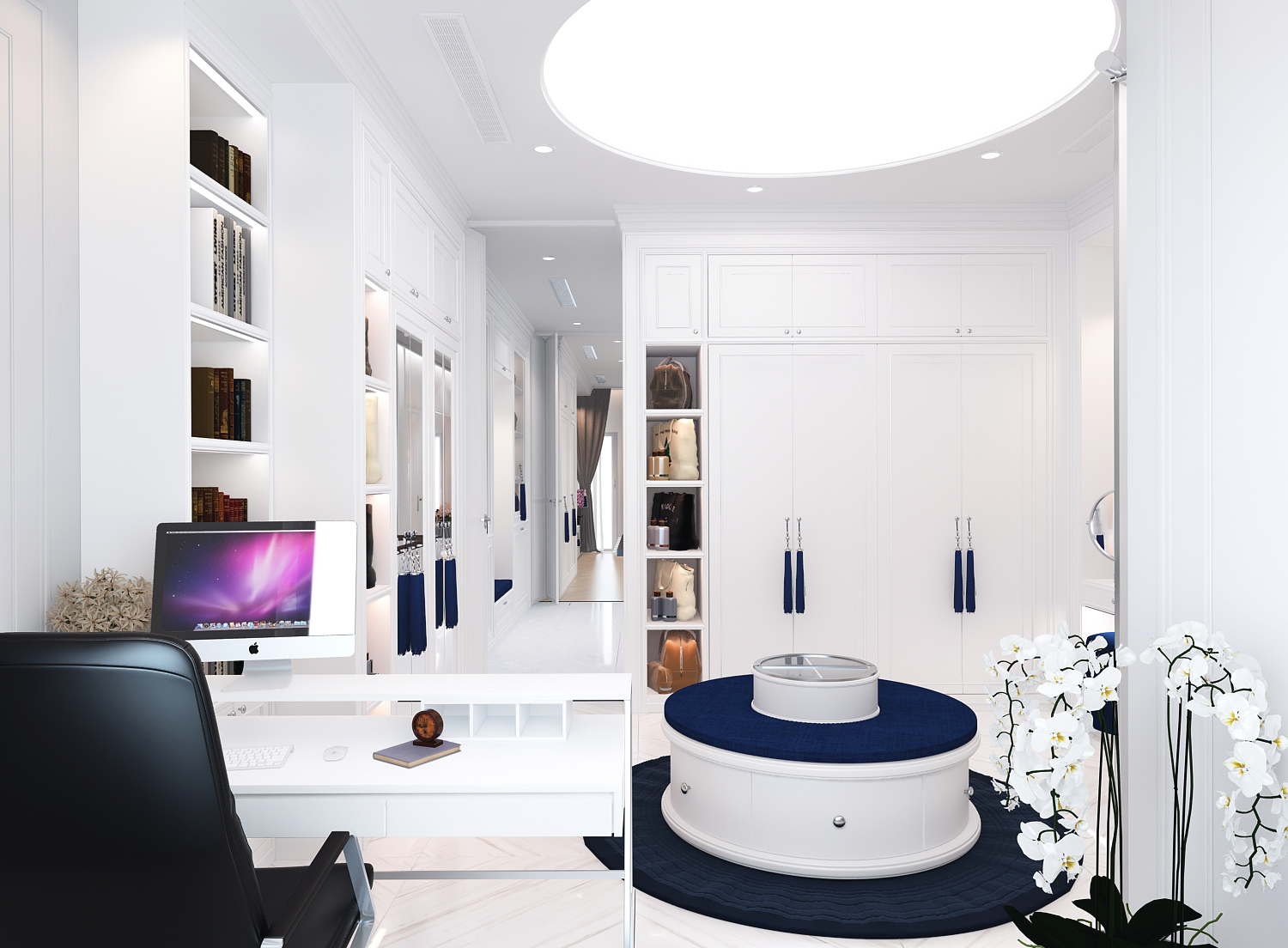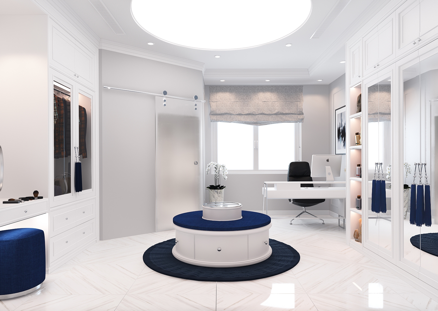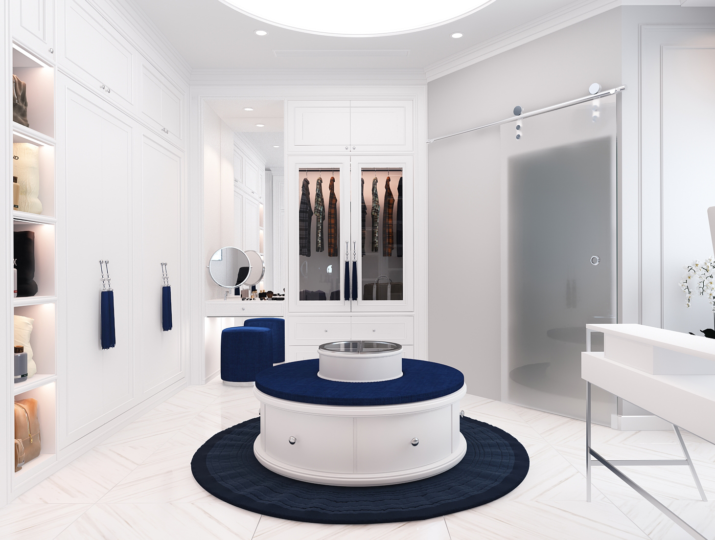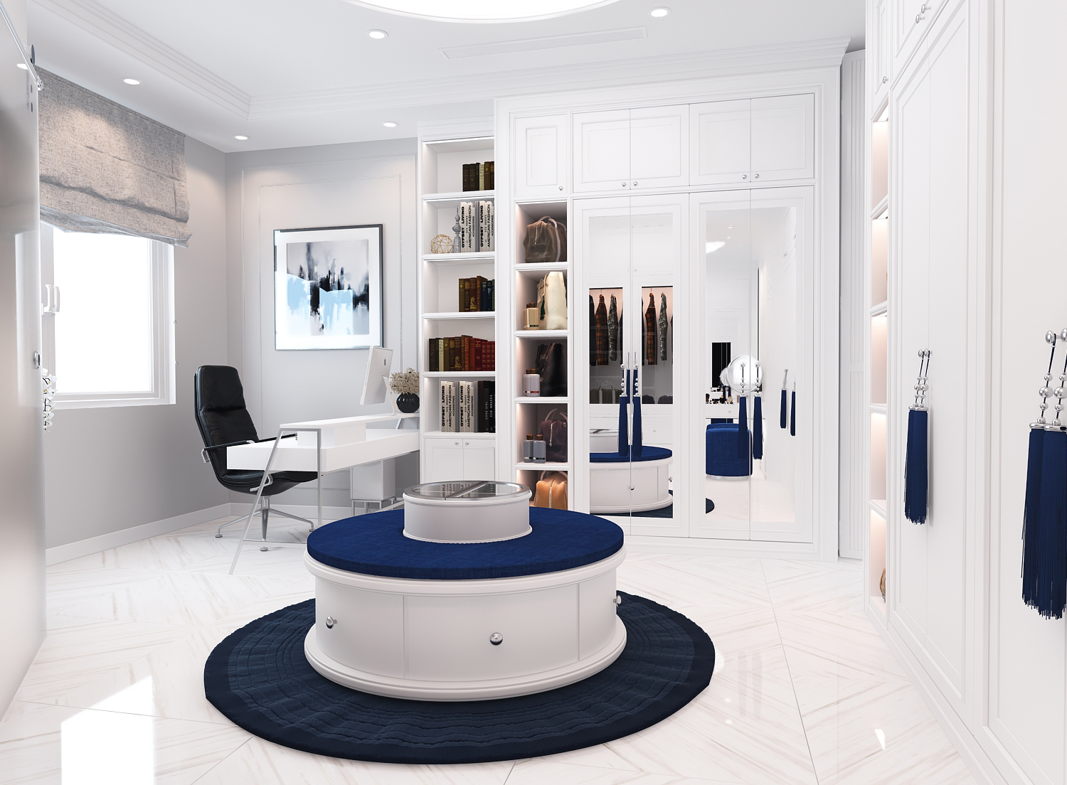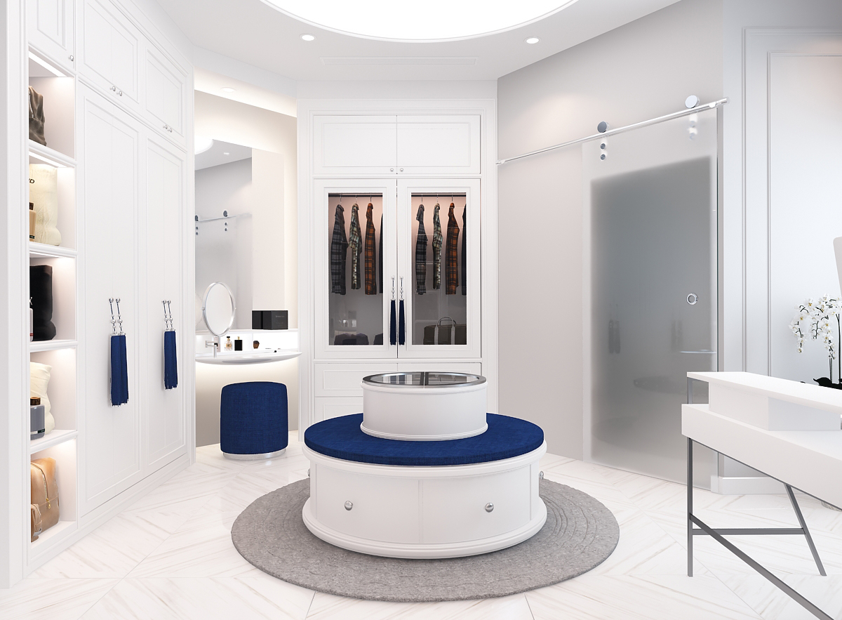 Các đường phào chỉ, vòm cong và chi tiết bo mềm được xử lý vừa đủ, không cầu kỳ nhưng vẫn gợi nhắc tinh thần cổ điển đặc trưng. Vật liệu vải nỉ, nhung và đá vân tự nhiên mang lại chiều sâu thẩm mỹ, trong khi điểm nhấn xanh lam – xanh navy được đưa vào khéo léo giúp không gian thêm phần trẻ trung, hiện đại.