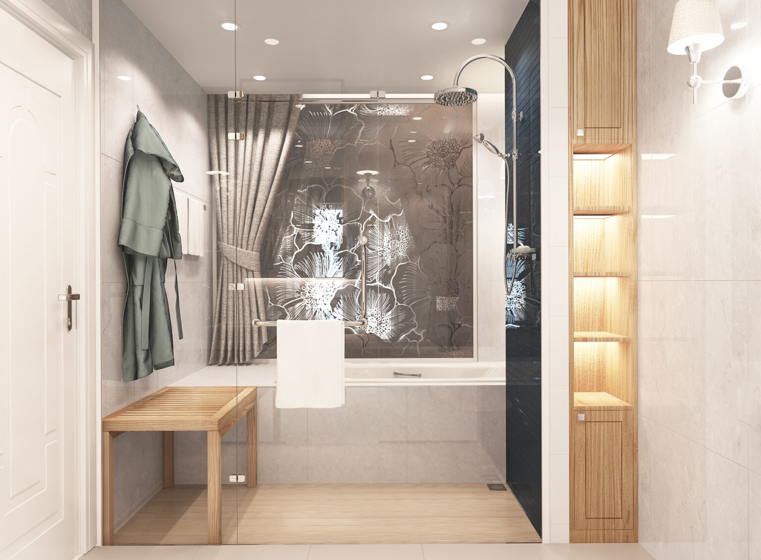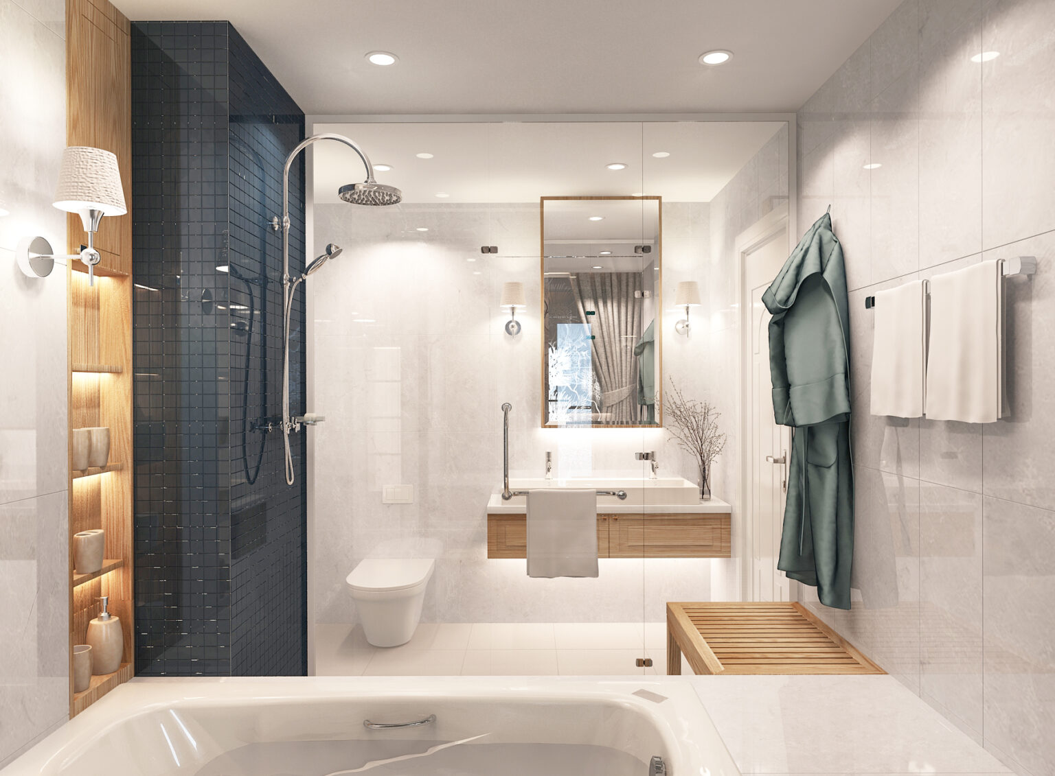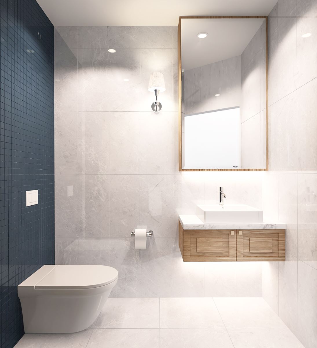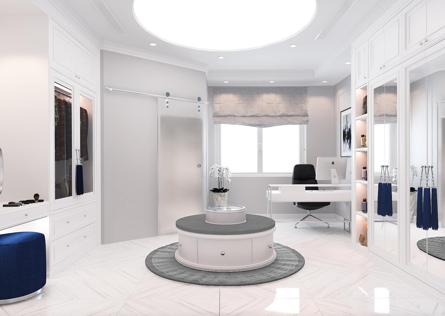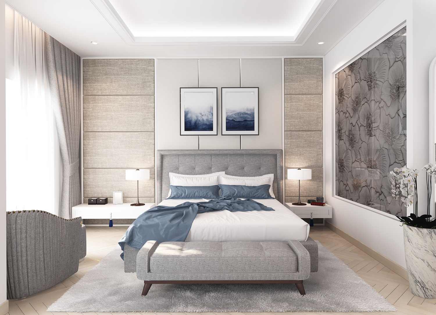Các đường phào chỉ, vòm cong và chi tiết bo mềm được xử lý vừa đủ, không cầu kỳ nhưng vẫn gợi nhắc tinh thần cổ điển đặc trưng. Vật liệu vải nỉ, nhung và đá vân tự nhiên mang lại chiều sâu thẩm mỹ, trong khi điểm nhấn xanh lam – xanh navy được đưa vào khéo léo giúp không gian thêm phần trẻ trung, hiện đại.