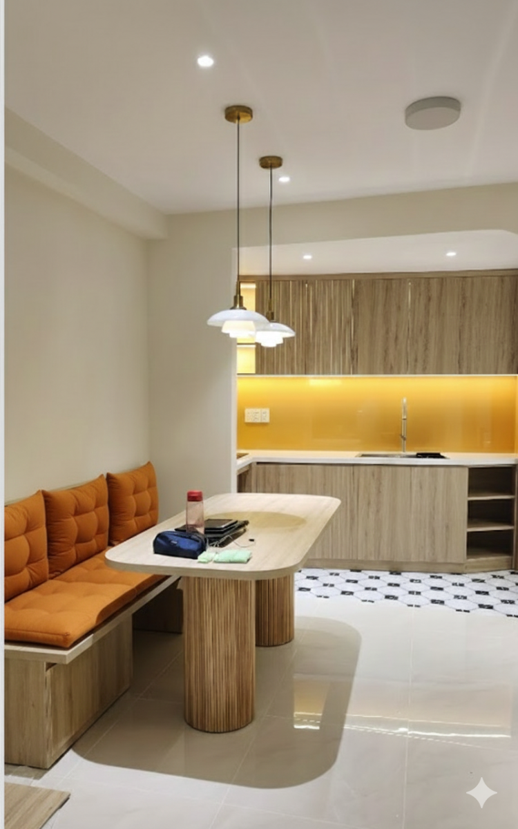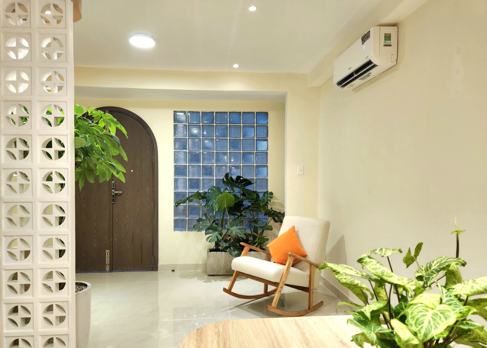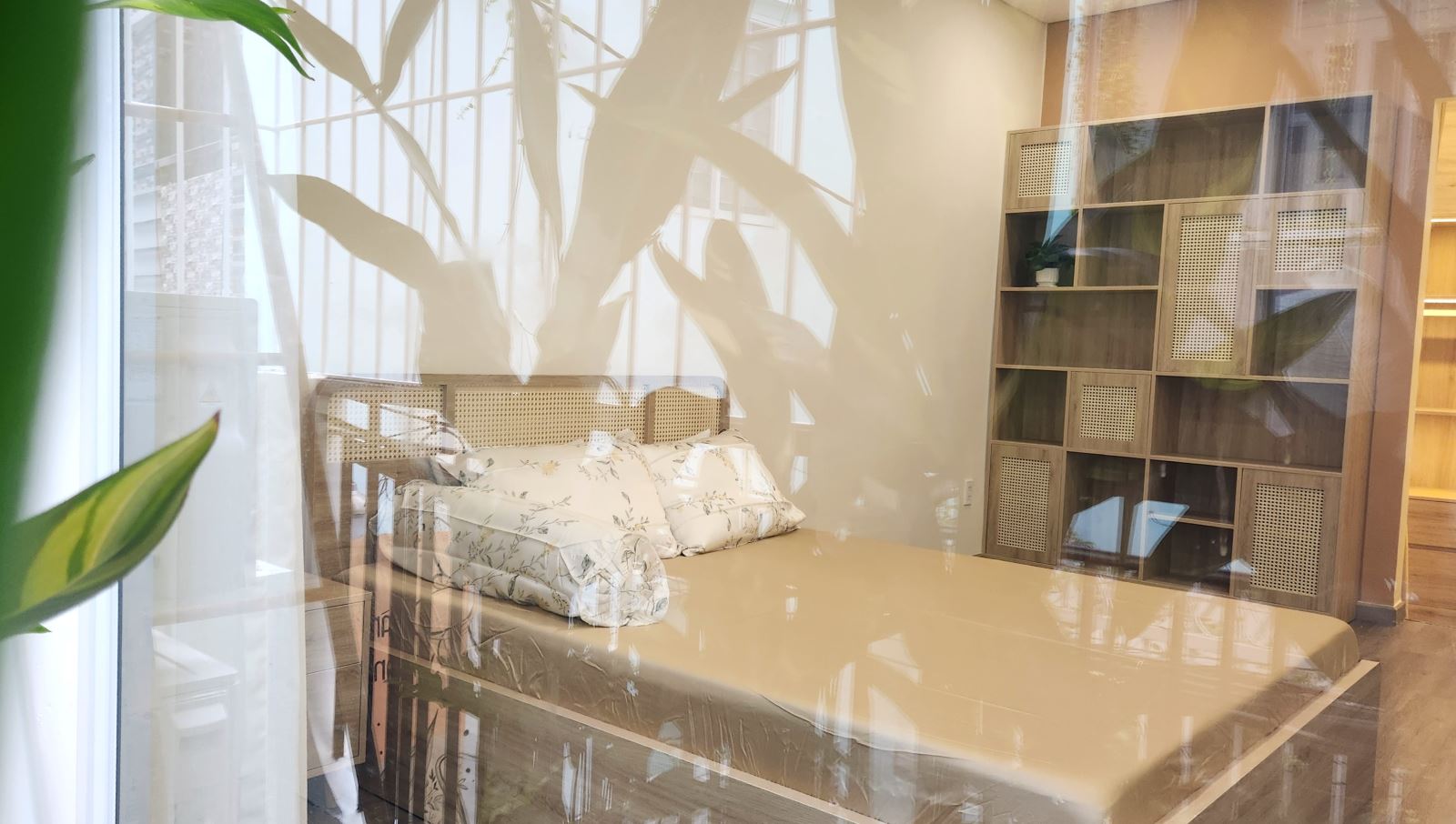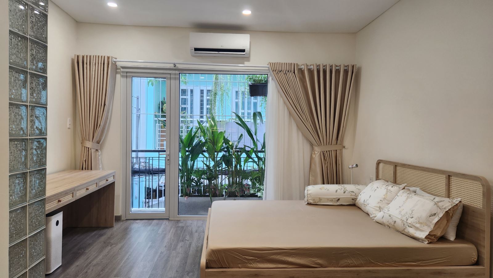 Chất liệu gỗ sáng và mây đan xuất hiện xuyên suốt, vừa tạo nhịp điệu thị giác, vừa cân bằng cảm xúc giữa sự mộc mạc và tinh tế. Những mảng kính gạch và rèm sáng màu giúp ánh sáng đi sâu hơn, đồng thời tạo hiệu ứng bóng đổ tự nhiên, khiến không gian luôn sống động mà không cần màu sắc mạnh.